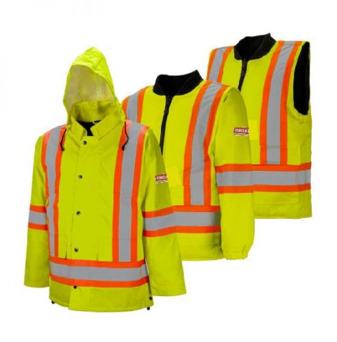 6-in-1 combination adapts to any weather conditionsBreathable, water resistant fabric with inner black liningHighly versatile and transforms easily to be worn six different ways4” contrasting colour tape with 2” reflective silver tape on the front, back, and arms provide increased visibilityTwo-way zipper front closure with snap storm flapTwo lower exterior pockets and multiple interior pocketsTwo outside patch pockets and multiple inside pocketsConcealed hood in collarComplies with CSA Z96-15 ANSI/ISEA 107-2015 Class 2 Level 2 (C291181XX and C291182XX)Complies with CSA Z96-15 Class 3 when worn with Class 2 Level 2 Traffic OverallsComplies with CSA Z96-15 ANSI/ISEA 107-2015 Class 1 Level 2 (C291183XX)Features zipper side entry access to waist